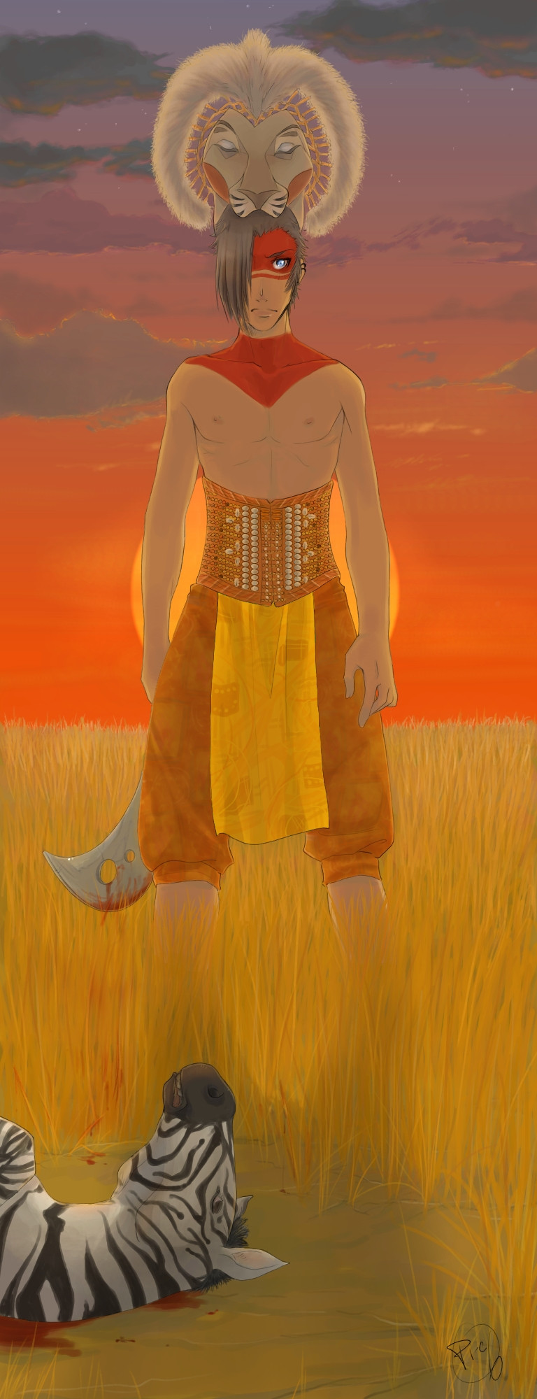 I'm glad this piece is so long. it gives way to a variety of emotoins as you're scrolling down. first thought was "wow this is well drawn" when i saw the top with the headpiece and his head, then it was "it's so bright golden and regal" when i saw the middle and the intricate corset thing with the blazing sun behind him, then i thought "dark and bloody and sad" when I saw the knife, blood, and dead zebra. it's so nice to have such a range of emotions from one image. it's a very well drawn piece and a very nice tribute to something that touched you. almost makes me wish i could have seen that play. (I do think the corset looks a little like an ear of corn though, which makes me laugh. I hope you're not offended)