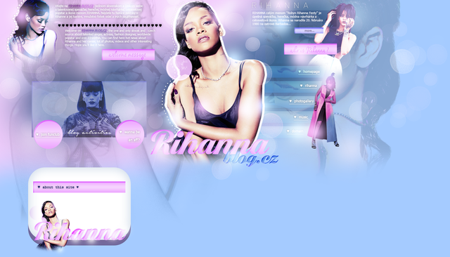 This is a PREMADE Rihanna website layout.>> It includes a header, background layer, 2 Rihanna images and png decorative elements. The welcome message text and content text in the picture above are just a sample, insert your own.