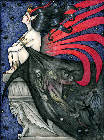 The sky was pretty easy to do actually - I masked off her figure first & then wet the paper. After the sky area was all wet (not pooled, but damp) I then put in puddles of colour - mostly Paynes Grey with Winsor Blue & Winsor Purple - and more Paynes grey Push the colours round until you get something you're happy with. Let it dry completely. Then, get an old toothbrush - water down some White Gouache, load up the old toothbrush & the drag you thumb/finger across the bristles! That's it! Instant sky! You should give it a try sometime - its easy & fun