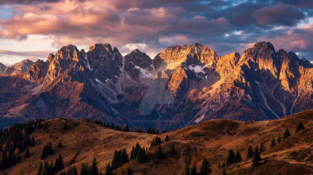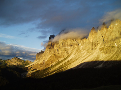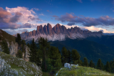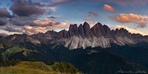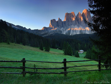 VillnΓΆss/Funes Valley, Dolomites, Alps, ItalyAfter the sun seemed to have already disappeared behind the hills some soft rose light and lit the wonderful peaks of "Geislerspitzen/Le Odle". I found a good foreground here and the clouds formated quite nicely too.