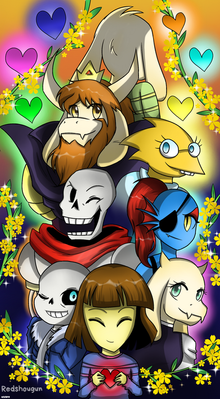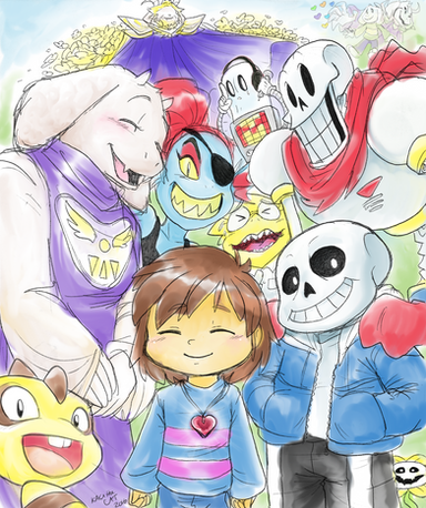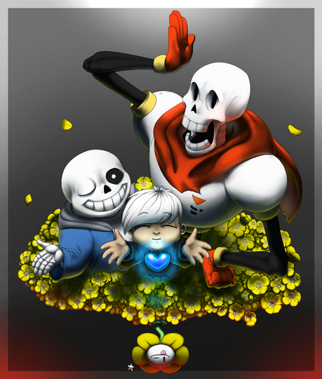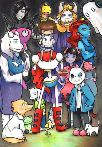 Well, it's about time I got something up for this new year. Working on this pic before I got a chance to play the game. Of course I knew I just could up up fan-art with out trying said medium, people will PUNCH ME!!! So one of my friends Sam (that's his icon right there)-> had the game himself, so I went to his house to play. We were at it for nearly five hours straight, by then I had made to the Hotlands. Would have gone on longer if it weren't for the fact that it was late and almost time for Sam and his family to have dinner, so I had to hightail it out of there. Ironically afterwards, I had a spaghetti dinner at a restaurant with my parents...I normally don't play vary many video games these days. Hell, I haven't even used my Steam account in a while, plus buying and setting them up can be a pain sometimes.... That...And I'm kind of a lazy bum... There I said it. But the more I kept seeing this game and what it's about, the more my interest was peaked. What I like about this game are it's characters. Most might already know the story but to those who don't, you play as a little kid that falls into a hole which leads to world filled of monsters who have been casted out of the surface world and forced to go under ground, by the humans. Your goal is to find a way out of the undergrounds, but it's how you go about doing that and the chooses you make that can and WILL effect the outcome of the plot. This is a very character/story driven game and since I'm someone who likes interesting character and touching emotional stuff, I was a sucker for this. To no surprise my favorite characters are Sans and Papyrus. These two skeleton brothers just kill be me. From Papyrus's over the top self confidence and shares the same love of spaghetti I do, to Sans's lad back attitude and ridiculous puns. Further reason why the Pacifist route is better. Though I had only made to the Hotlands, I do know the true ends of the game thanks to YouTube and Game Grumps, though I still do want to see it for myself. I'm glad I was able to get some game experience in. Sooner or later when schools over I may finally buy it for real and once I do I'm gonna go full pacifist mode on it and probably never touch it again afterwards because it would mean undoing everything and this game knows....