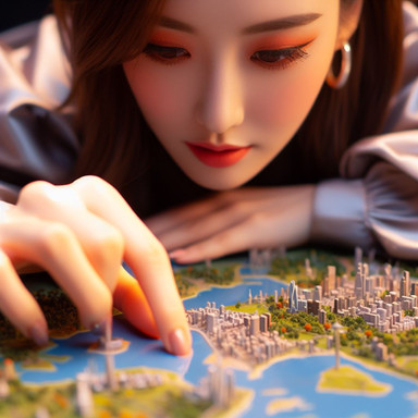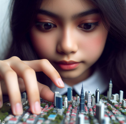 I meant that a mother watches her daughter playing with a microscopic city in a childish room.
