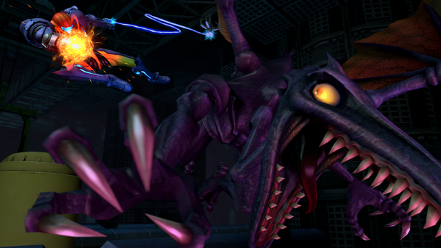 Those teeth are legitimately terrifying!Β That is a bright shine on Samus, especially the charge beam.