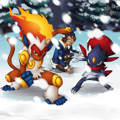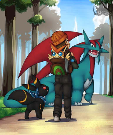 I really love this kind of Pokemon art, trainer with their team <3 Great job!