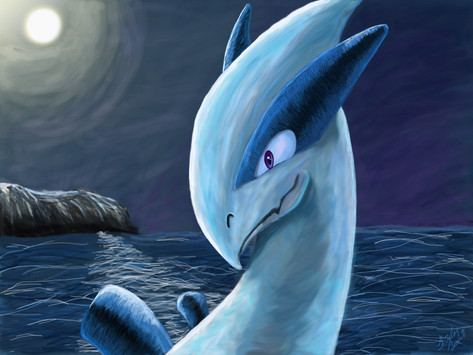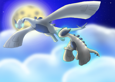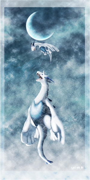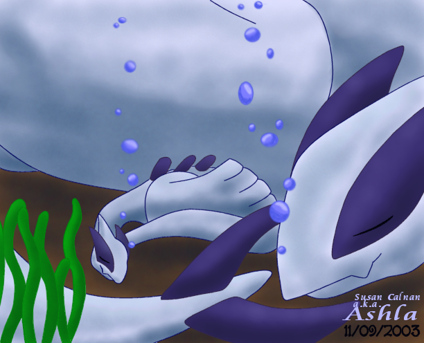 awwww how beautiful this picture is! lugia there looks so lovely!(the adult one) and the baby looks soo cute!! it's quite a sad picture for me of how that lugia will pass away then the baby lugia will be the new guardian of the ocean.