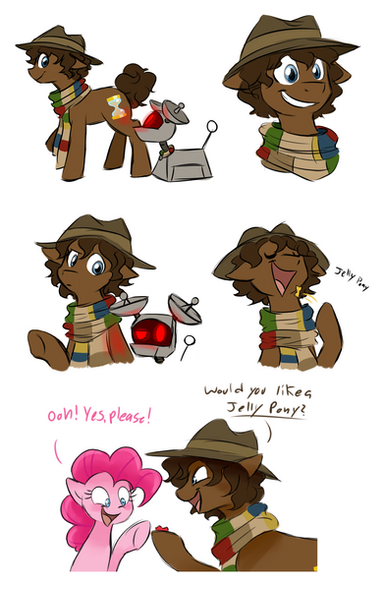 Well, I figured that his first transformation from homosapien to equine form would be a bit disconcerting for him, so at first he would be leaning towards more outbursts. However, being with Pinkie Pie (his first componyian)would soon turn his outbursts into staring into nothingness for a few hours while she bounced about the room talking and talking...and talking. Once they are both used to each other (mostly him used to her XD) he'd be back to his mellower self.(they'd be stuck traveling on the TARDIS for a while and ending up at random places and times within the Equestrian universe b/c the Tardis was not meant to be operated by hooves, and plus he can't reach some of the controls without a foot-stool b/c he went from 6 feet tall to about 12 hands tall.)