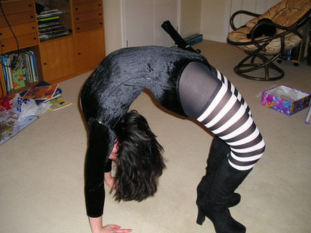 'tis a pic of me taken in my back yard on a really sunny day... im in a tight backbend, and wearing the typical dancer stuff... Hope y'all like it. and oh by the way... i am a contortionist, and yes this does hurt a bit hehe.~heather~