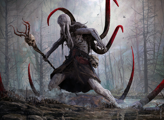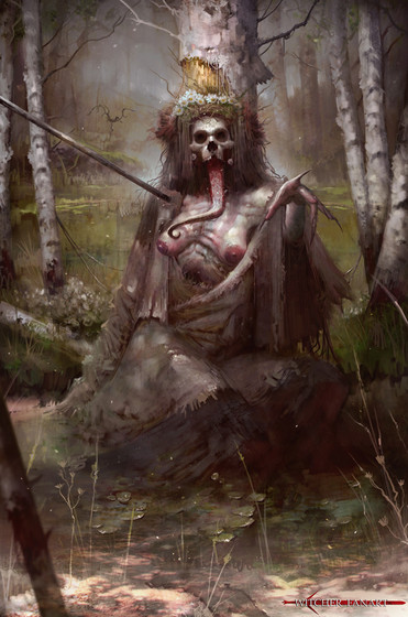I love how 'fleshy' and 'rotted' everything looks, even the trees and grass. I really have a lot of questions about the subject the longer I look at it - was it formerly the figure it is coming out of, or is it just absorbing its essence? Does it kill others to get 'material' to use when it shifts? And what is the little orb hanging from its face? It really draws a lot of attention with its brightness and dissonant colors, but I can't really make sense of it. Really amazing piece!