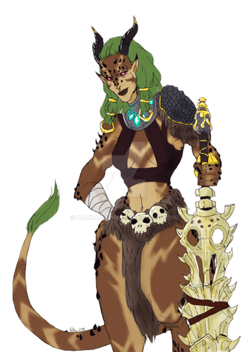 She's 6'4" and very strong! As such, she's a natural when it comes to raiding, striking fear into the hearts of her enemies. Unfortunately for her, she seems to have happened upon a cursed artifact while spelunking, and it sure doesn't seem to wanna come off her neck.