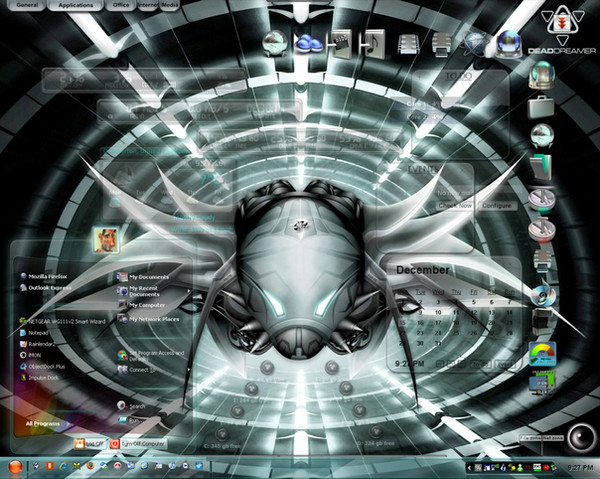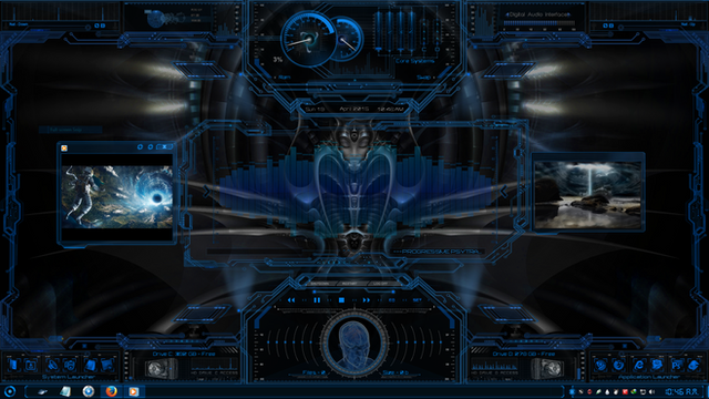 This theme started a loooong time ago as a WindowsBlinds skin by D.A.K. The legendary themer-skinner, treetog (Renato C. Veras Jr.) [link] took it one step further (many steps, in fact), creating various themes and skins for NextStart and other applications. All the graphics here, with the exception of the wallpaper and the wharf icons, are his, used with his permission. The wharf, the meter plugin etc. are all pure bbinterface.