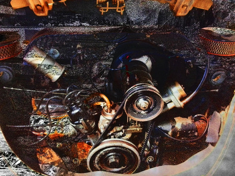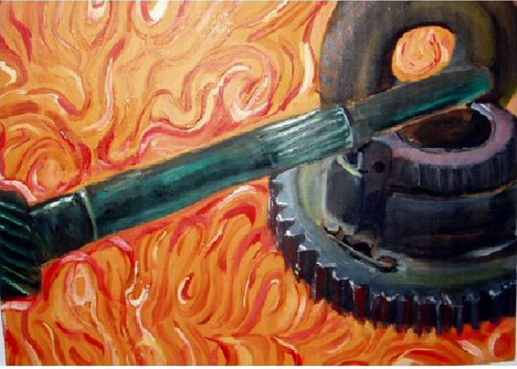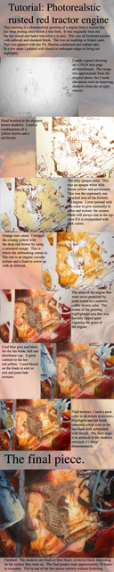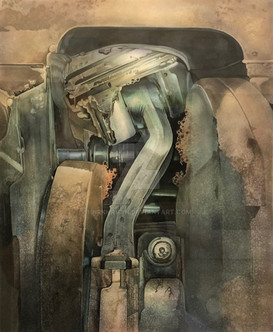 I have submitted a tutorial of how this was painted. It is freehand airbrush ink on paper.There are several things about this that intrigued me. The is a story element if you just look at an engine. All the components work together and if you have done any mechanical work it's natural to identify the parts. So naming the order of things and how they work is one story, but there was always something else going on here. The center of the engine block was torn out. Most of the engine was covered in paint and was somewhat protected by the elements, but the earth brown parts are purely rusted metal.