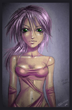 This is a really beautiful piece not only in technique, but also in thought. I love all the shading, especially the pink highlights on her skin and clothing. The hair is gorgeous as well. The background (to me) actually does give the illusion of headlights, like when it's raining and and the lights get all distorted.