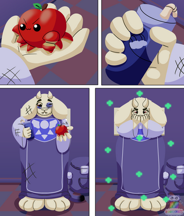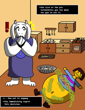 Asriel enjoyed it so much, he starts scarfing it down. It causes his whole body to turn blue and cause his belly to bulge out