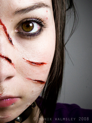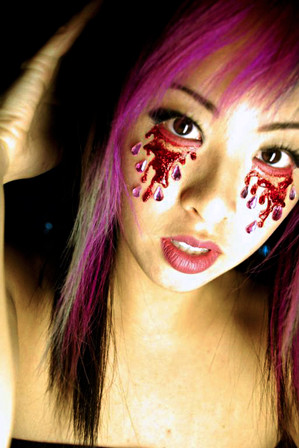 I love how intense this image is! I saw it as a small thumbnail and knew I had to open it into a bigger frame1 My only concern with it is the color in your eye. I would never put any color into my eye the way that you did. It does add more depth to your picture but at the same time you could have lost your eye. I recommend contacts next time. They can be costly but it could save your eye. it is an amazing effect though! the technique you used for painting the stripes and the blood are smooth and look super realistic when the image is in thumbnail it looks like a real tiger. I thought it was a splice of images! for your next image if you choose to paint your face try applying a thin layer of baby powder over the area so that it is easier to clean and will not stain your skin. Also if you use drip blood on a q-tip it looks more realistic. Other than that amazing job on the make-up. Keep up the good work!