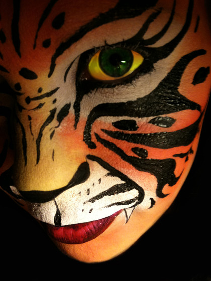 You did a very good job on the texture of the makeup, because it actually looks soft like the tiger's fur in places, and the globs of fake blood are 3-dimensional.
