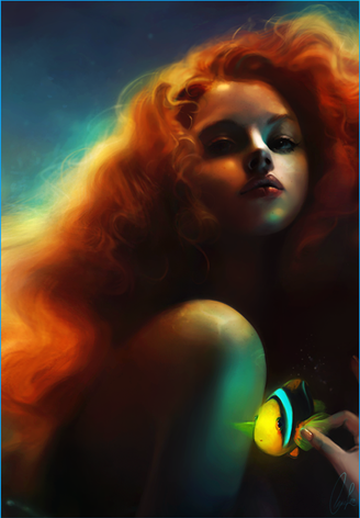 The first thing that drew me to this piece of art was the vibrant colors. There's the electric blue skin that shifts to shades of teal, the an almost purple colored face with hints of blue, the orange and yellow jellyfish fish that almost mirror the color or the mermaids per icing yellow eyes. Last but not leas she has long locks of crimson red hair.