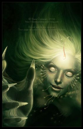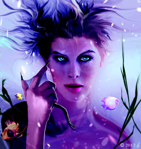 I love how the eyes pop from the skin and how it matches the hair,beautiful. I like the hair and the wave of it. The color of the hair is eye catching. This piece is impossible to miss! I love how the ripples of the water reflect off her and look as if they are markings, you have done them with great detail. I love the color of the lips it matches the skin and eyes perfectly. I love the jelly fish to the side and how it glows. The great detail of the jellyfish's stingers and tentacles are amazing. I love the colors you used for the jellyfish. I like how the hair complements the head shape. I love the shadowing of the eyes. I love the shine of the hair. This piece does remind me of ariel the little disney princess. This is not her this is the other side of ariel. The real version. This piece is amazing.
