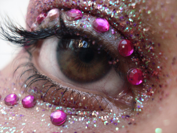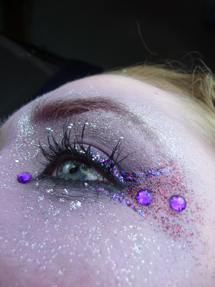 The vision is truly magnificent, I love it. Though others have said that you should use foundation, I personally enjoy the skin not being so impossibly doll like. WHile I like the colors, and get there meaning, I think that they could have related more to each other. Perhaps making the colours on the leaves a little darker, or matching everything else? I would also suggest maybe a bit of gold touches, just a bit, in the white streaks below the eye. I must add though, that I absolutely love the beads on the eyelashes. Absolutely gorgeous. Maybe, instead of gems, you could have done pearls, like candy pearls! I also love the contact. Beautiful! Wonderful piece!