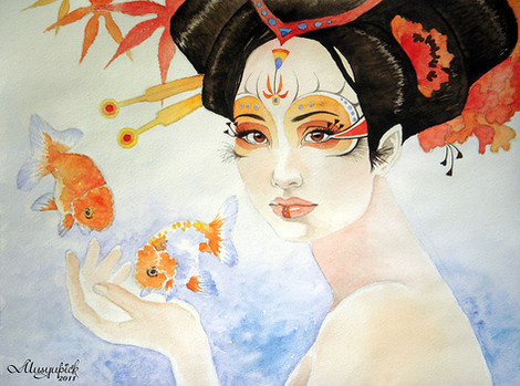 2. The amount of details in this work and their composition is awesome. I will restrain myself to those details I like most. The headpiece for one is beautiful but I especially like the shine you put on the pink and green gem. The same shine is on the bubbles and the blue pearls. To be honest, I was sure at first that this was alterated with CG. My favourite detail (if one can say it is) are the koi's fins and its scales. You did wonderfully there. I also like the patterns on her dress and in the general background.