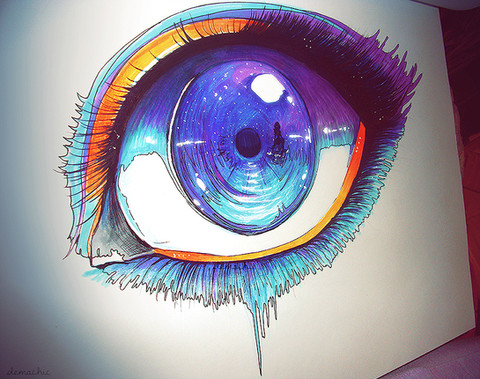 The emotion that you drew in this eye is amazing. Each brush stroke is perfectly done and beautiful, strong bright and perfectly fitted colors. The attention to detail on the iris is shocking. It as if a water spirit is crying, and the drips in the paint just enhance that. The reflection and shading is done extremely well, definitely one of my favorites of your eyes.