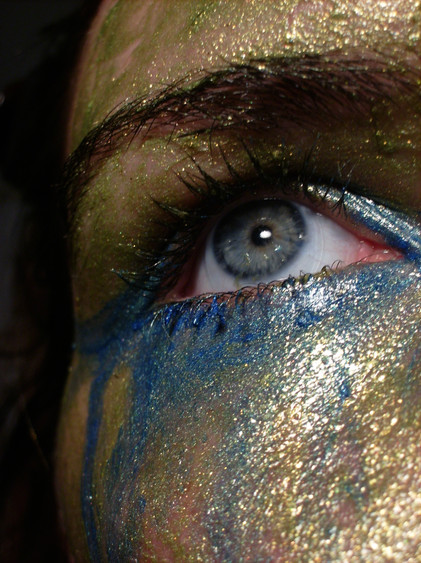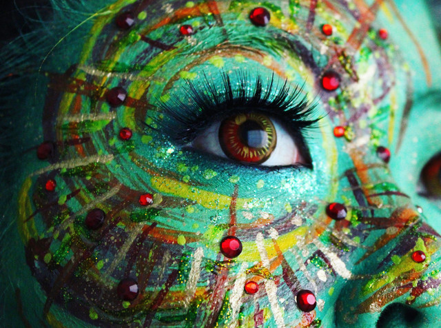 My favorite is the thorns on your eyebrow, really makes the flower stand out as rose, flowers are often used in makeup but the thorns make you know it is a rose, rose which has always been the symbol for sleeping beauty. I love your bend of pink and white color around your eye, with the glitter it turned out quite nicely. The flower itself I can imagine must have been uncomfortable, but it and the little gems under your eye really give it flavor. Lastly I love your lighting on this piece how it goes from pure black into a very bright light, not just an amazing make up piece but a good piece of photography as well, keep it up.