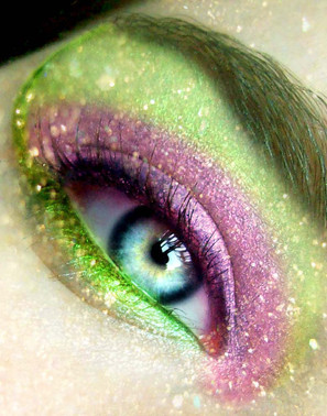 Technique: This is the highlight of a great deviation. Not only are there bees in it, but she has purple hair, and there are flower petals. The tips of the flower petals are blue to match the makeup, and yellow outside of the blue. There is also glitter which is sort of the cherry on top. I love the dots of yellow, too. And of course, the bees are great.