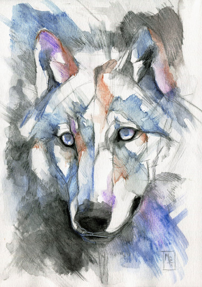 i love this artwork! perfectly contrasts the blue-greys of the dog with his bright eyes and the orange butterfly.