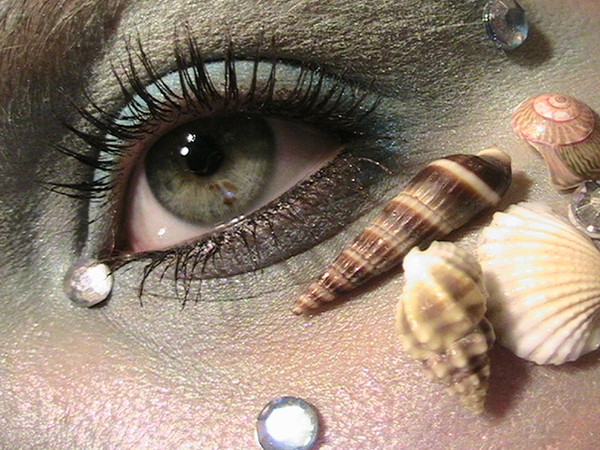First of I'll start by saying I love the make-up. The red eyelashes contrast with the blue and green of the glitter and eye shadow.I have to say I'm amazed that you can get a snail so close to your eye. I love the yellow flower against the greeny yellow and black spiral of the snails shell. I love that you made the snail look friendly and you look so relaxed I add to the (warmth)? and comfort of the piece. All I can say is its hard to find a single flaw in this piece and I am so amazed, WeLL DoNE!