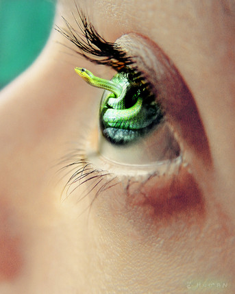 The way the snail coast around the edge of the eye is a somewhat suttle yet all too human indication of it's profound freindliness. The open and somewhat defiantly relaxed eye is a centerpeice for the comfort of the whole picture. The underlying theme is that the person bearing the snail is confortable with nature and is not put off by any asthetically perceived messiness of it. It is overall well styled and framed. I must say I adore the reddish eyelashed as they compliment the overall color sceme of the picture. I must finish by saying this is a simple yet obvious reminder of the many forms art can take, when it is all said and done it is defficult to find a flaw with this so well done and nice.