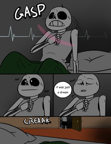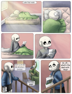 Sans is missing a teeth. Either he lost it in those experiments or he really is pretty young and still a child. I like the idea with the shirt, because it's totally something Sans would enjoy, knowing how much he loves bad puns. I also need to point out that I like that you keep the skeletons like actual skeletons. I don't know why, but I always feel a little thrown back whenever artists make Sans and Papyrus look too much like humans. So, in other words, I like the design you gave them here. And I need to know what happens next. I kinda assume that their grandfather will offer them tea, since the title of the comic is But first, tea.