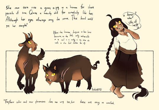 Pretty basic stuff about the Hulder. Ebba is like most Hulders, but she doesn't stay in one forest as she's too scared to get exposed. She is neither good, nor evil. She just does exactly what pleases her. But as it says on the ref, she wants to find a place where she can rule without being afraid to be exposed and hunted down. Her dream of having kids is because she'd love to have people to boss around.
