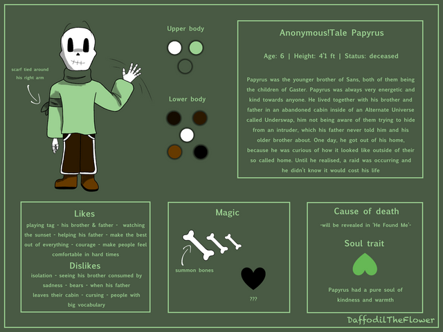 Despite of who he may have been supposed to be, in my story he serves s the grandfather of Sans and Papyrus, and the father of Wing Dings Gaster.