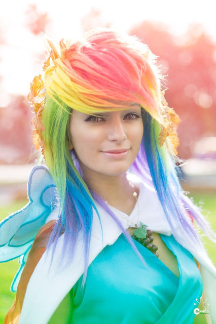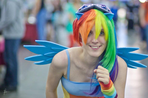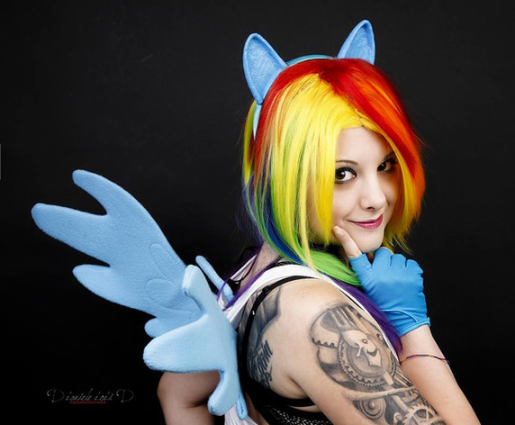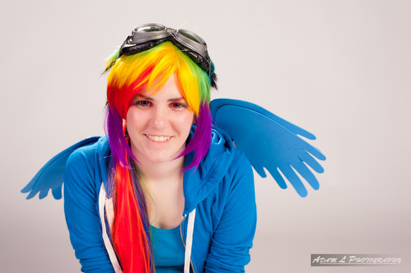 Wig, Wings, cutie mark necklace and rainbow socks currently for sale-click for more info! -- or message me if you're interested!Me as Rainbow Dash from My Little Pony: Friendship is Magic! Obviously a super easy fun costume for Otakon 2011. I colored a white wig by hand with Sharpies, made the ears, wings and cutie mark necklace. Everything else is bought.