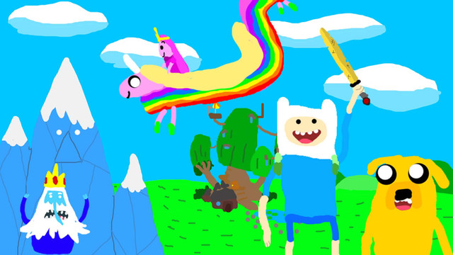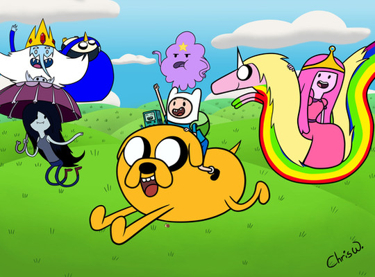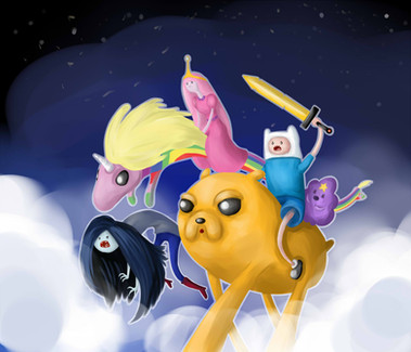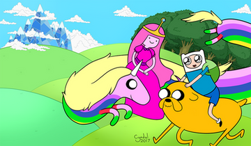 Another picture that took me a while to finish and very proud of it XDDFinn and Jake riding on Lady Rainicorn's back around The Land Of Ooo ~
