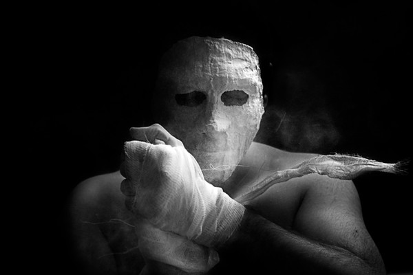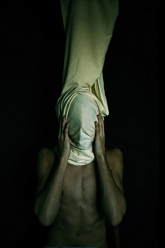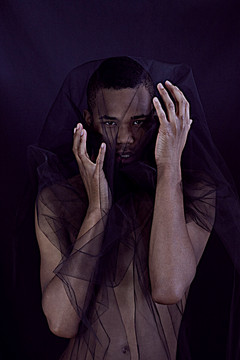 There is a phantasmal quality to this one which I enjoy. The black background, the faltering light, hands clawing at the empty air, and the wet veil which gives your face a skeletal, despairing appearance. Very well done.