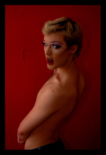 striking, barely fit in the room, some things stylized or strongly contrasting, the lipstick, the tights, the photos, their reflections, the light, the shadow, the wristlets (name?), the hat; and then the face looks very real
