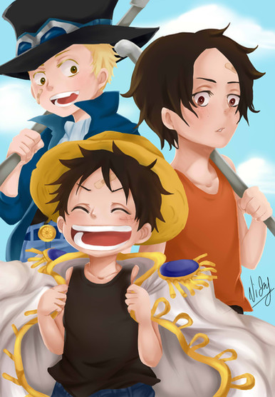 How can we possibly be overwhelmed, when your gallery is filled with so many beautiful and funny works of art? This is not an exception, I really like it! Like the contrast between Ace and Sabo's serious expressions and Luffy's hilarious and obvious expression. It so fits the characters and their adventures. Luffy's always going off doing his own thing at his own pace. All three boys look wonderful, and the picture as a whole is great. I kind of wish Luffy looked a little younger than his brothers, though, perhaps with a bit rounder face or something, but that's nitpicking ^^ Also, I'd make Sabo's eyes blue, but he looks good with brown eyes too