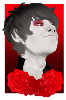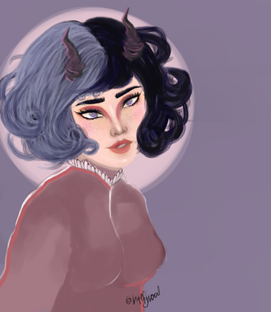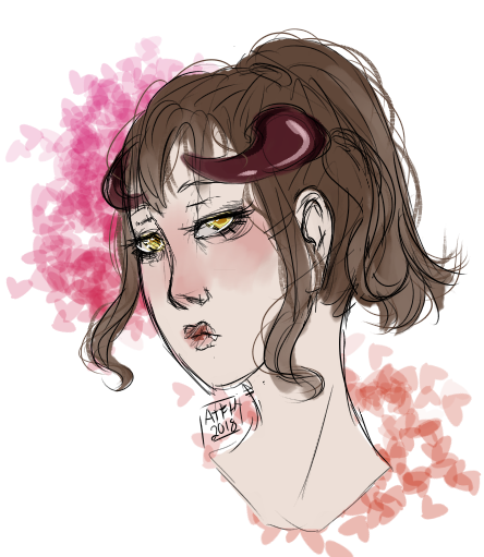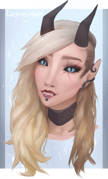 My advice to you though is to next time make the nose face more downwards, it seems too upturned for the position the head is in. The lips as well could be widened a bit, they look a bit too small in comparison to the rest of the face. Another good piece of advice would be to more clearly define where the hair splits on the top of the head, it makes the hair look more realistic and well planned out, but what you have right now is not bad! Finally what I recommend is painting the horns on a character first, then the hair going around them, it allows you to easily make the illusion that the horns are coming out from under the hair, while right now it partially looks like they are in fact on TOP of the hair!