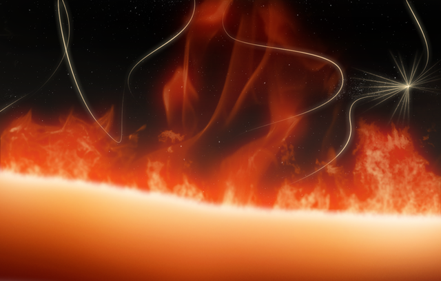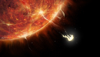 All of the red dwarf stars in the Castor system (Ca, Cb, Ab, Bb) are classified as Flare Stars , and you can see a giant solar flare in progress on the the star in the foreground.