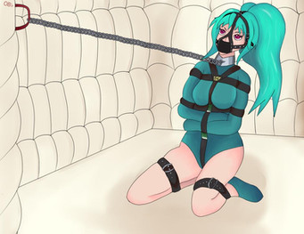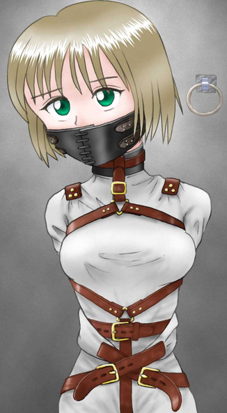 Wow, what a powerfully strict gag! Not to mention that strict harness AND a chain with padlock. Is the outfit meant to be some sort of leotard with straps on top of it, or a form of straitjacket? Either way, it's excellent, but I'm curious.