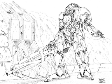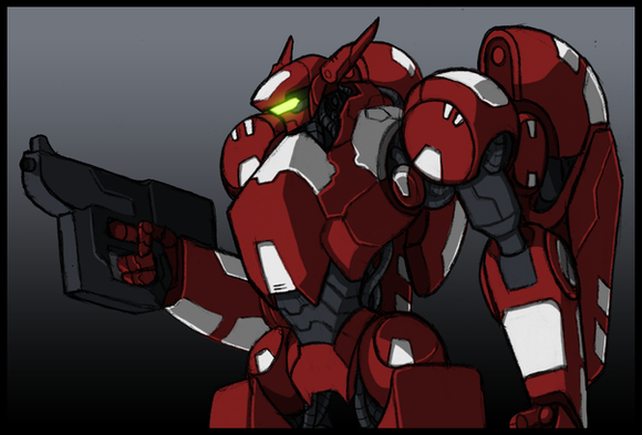 From the 21st Mecha Sketchbook , this is a shot at cel-coloring in the GIMP. A lot of highs and lows as time went on; I could sympathize with the machine's attitude right now...Most fun: the LOL SHOOP-DA-WHOOP LAZERS!!11 and the elbow power plants' exhaust flames. Indirectly referenced the SR-71 Blackbird's engines on afterburner for color ideas (here ).