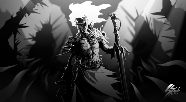 #ambience #arrows #blackandwhite #bones #characterconcept #characterdesign #demon #devil #digitalart #digitalartwork #digitaldrawing #digitalillustration #digitalpainting #grayscale #illustration #lighting #monochrome #painting #pitchfork #pose #raining #rimlight #shine #spear #drawingdigital #clipstudiopaint #glowing_effect #stylizedcharacter #skeleton