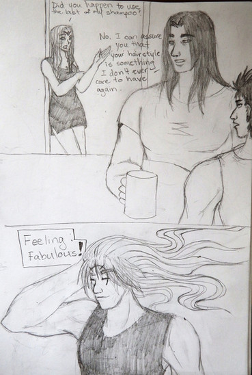 “Uh…” War pulled a comb out of his pocket and gave it to his sister, “Could you… Could you help me untangle the knots in my hair? I got most of them out, but I can’t untangle these ones.” She looked at his hair suspiciously, “Did you go swimming and let your hair dry without combing it through again.”