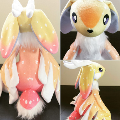 She is a one of a kind plush. She is 8 inches tall from her base to her ears. She is made out of minky and cotton with safety eyes, pellets and polyester stuffing. She also comes with paper flowers with a pompom tail.She still needs to be handled with care since it's a hand made item and some bits are hand sewn and might tear if she is pulled at.