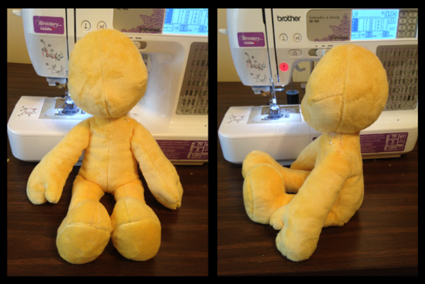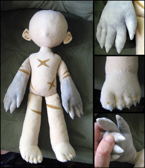Funny story, his skin is actually hand-dyed artificial fleece. It was my first attempt at dyeing ANY kind of fabric and, not owning any proper dyes, I had to mix my own. I used a mix of peach-tea Crystal Light, food coloring, vinegar, and water, and simmered the fabric in it for about two and a half hours.