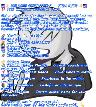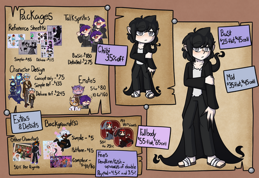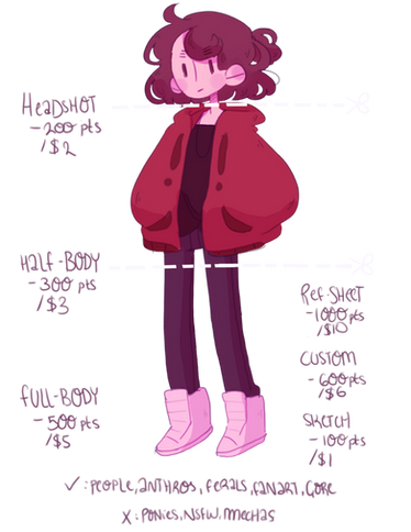 HI! So, just to make things clear for what I meant by moodboard/Surprise customs: Basically, you give me a moodboard and I draw based on how the moodboard is while you give me little details on what you want to see on the character! (basically I base more of the design based on the moodboard!)while a more specific custom would be every little thing you want on your custom! (I'll send wips to make sure I make what you want <3!)