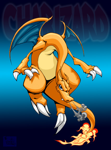Great work on this! The jagged lines of its claws and face contrast well with the swirls of the tail flame and smoke.