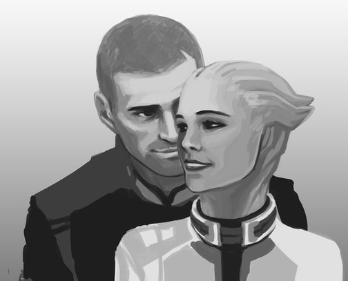 Congratulations on drawing the first non-disturbing Kaidan I've seen so far. Even though he's human, most fanart I've seen of him is strangely warped, and the rest don't look like Kaids at all. I think it's weird that the aliens get a larger proportion of good fanart. I mean, Garrus can't be easy to draw. So, this Kaidan looks like himself and... healthy, and Shep looks cute in addition. Nice job! ^_^