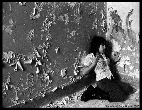 She is wearing close to nothing in what must be a cold abandoned building, and there are 2 coats hanging on the wall.