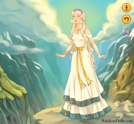 Credit to www.azaleasdolls.com/dressupga…Lady Rhea Titaness mother of the Gods and the Goddess of female fertility, motherhood and generation. Roman name Ops. Wife and sister to Lord Cronus and mother to Lord Hades, Lady Hestia, Lord Poseidon, Lady Hera, Lady Demeter and Lord Zeus. Sister to the Hecatonchires, Cyclopes, Lord Oceanus, Coeus, Crius, Hyperion, Iapetus, Lady Theia, Themis, Mnemosyne, Phoebe, Tethys and Giants. Daughter of Mother Gaia and Father Uranus.
